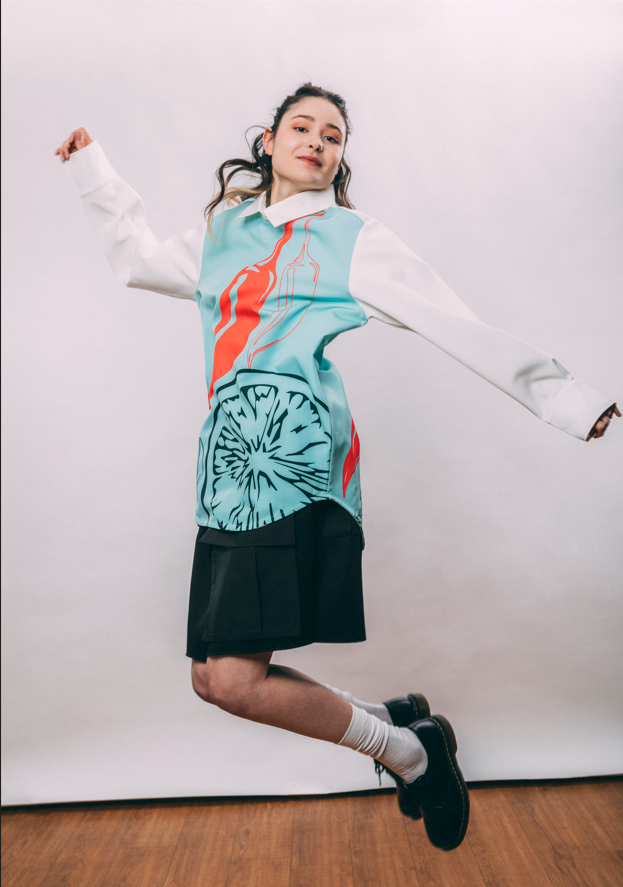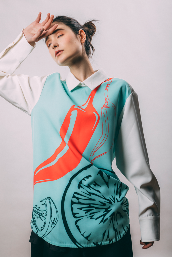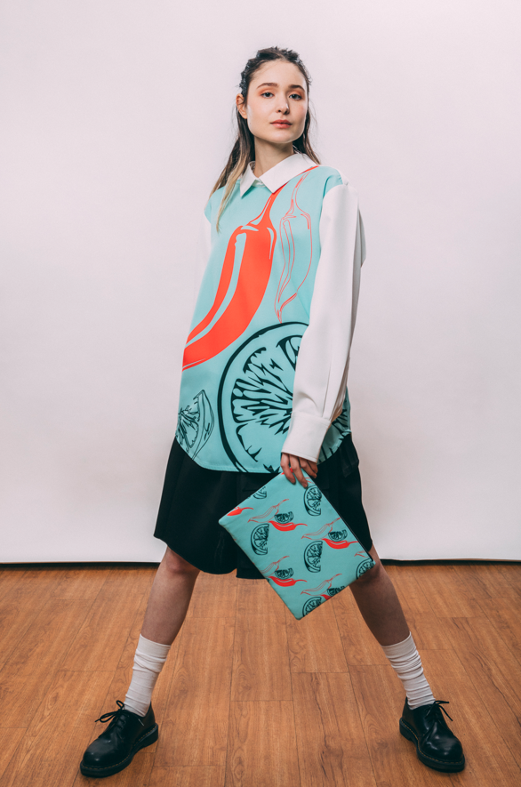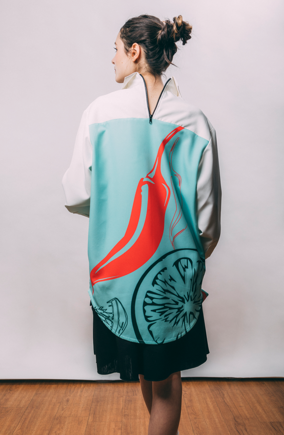The Chili Lemon Shirt is a bold statement piece that blends graphic artistry with a clean, structured silhouette. Its oversized print is a vibrant mix of a red chili pepper and a stylized lemon slice, on a soft mint ice cream background. It brings a fresh, contemporary energy, while the mint-blue background adds a cool, luminous contrast. The classic collar and crisp white sleeves balance the design with a touch of sophistication. A refined piece that we close with a streetwear touch by adding a contrasted plastic zipper in the back. You can wear it with our Busan shorts, as Mina does. Or wear it with our iconic Kingswood.