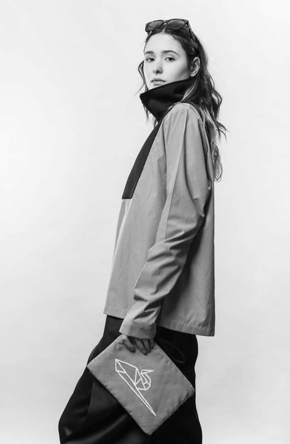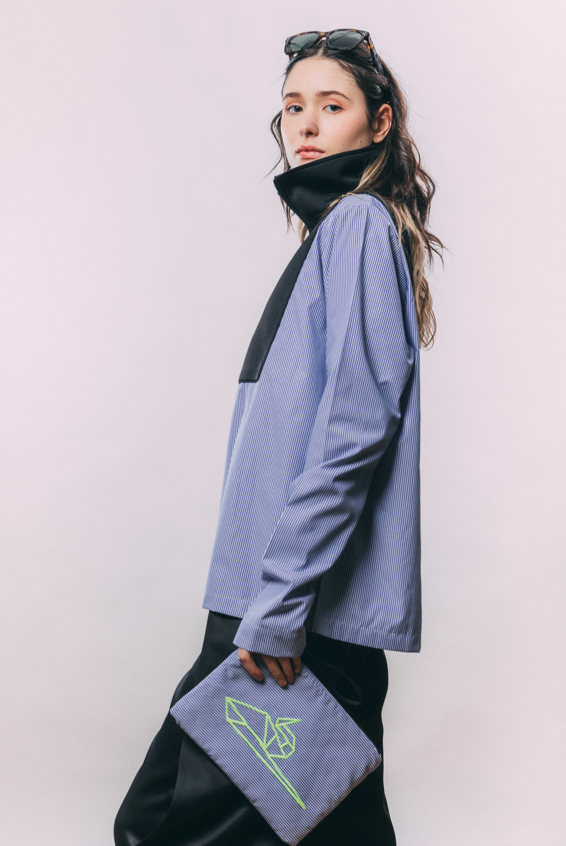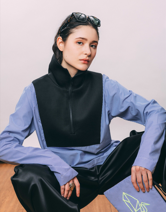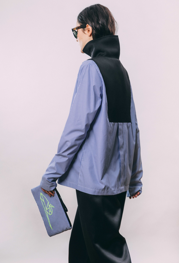 A hybrid piece that blends tailoring with technical inspiration. This shirt features a classic shirt striped with a bold contrast panel and a high stand-up collar with a zip closure. The result is a sculptural, graphic silhouette that elevates a classic shirting shape into something distinctly contemporary.